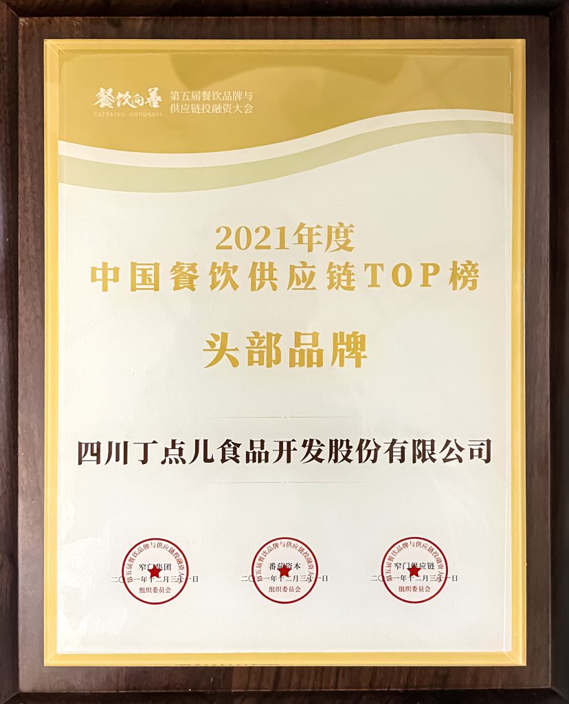 ? ? ? ? 在此次評選活動中,丁點兒股份獲得各界評委的一致認(rèn)可,從參評的3000+個同類供應(yīng)商品牌中脫穎而出,獲得“2021年度中國餐飲供應(yīng)鏈TOP榜頭部品牌”稱號。此項榮譽是對丁點兒股份在中國餐飲行業(yè)做出卓越貢獻(xiàn)的高度肯定,也是對企業(yè)發(fā)展前景有著更高的期望。
