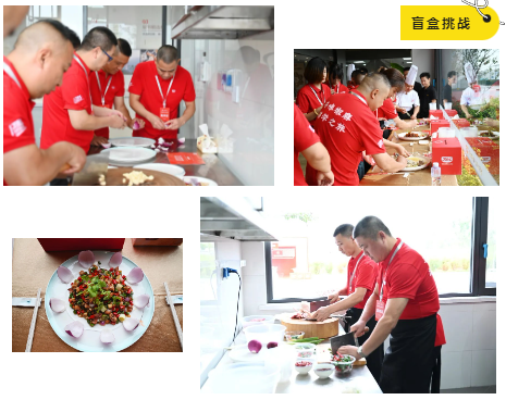 現場,大廚們還以分組抽盲盒食材的形式,現場進行菜品制作挑戰。大廚們摩拳擦掌、分工有序,用丁點兒干鍋醬、藤椒油、金湯酸菜醬、椒麻雞汁等產品快速出品了一道道色香味俱全的美味佳肴。