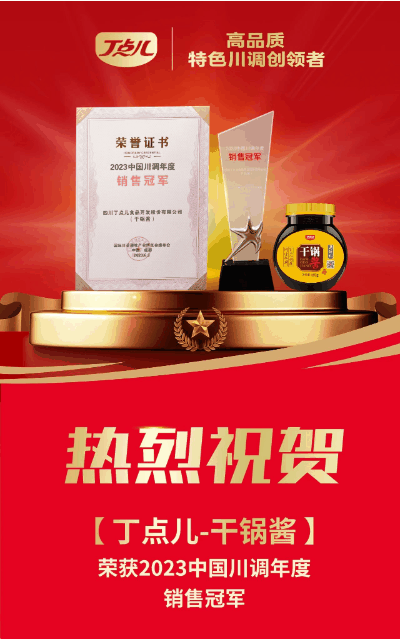 丁點(diǎn)兒干鍋醬、椒麻雞汁、藤椒油、麻得倒紅花椒油、老壇酸菜醬等產(chǎn)品更是在“中國(guó)川調(diào)之夜”大放異彩,獲得了品類銷售冠軍、品類十大創(chuàng)新產(chǎn)品、品類十大影響力品牌等多個(gè)獎(jiǎng)項(xiàng)。