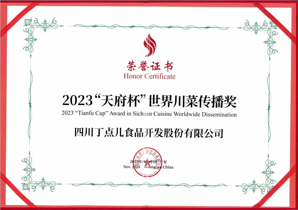 憑借出色的企業(yè)影響力和巨大的發(fā)展?jié)摿Γ↑c(diǎn)兒食品在這一年又?jǐn)孬@了多項(xiàng)榮譽(yù)。“年度超級(jí)品牌之星”、2023“天府杯”世界川菜傳播獎(jiǎng)、第十一屆中國(guó)食材電商節(jié)-優(yōu)質(zhì)企業(yè)推薦等稱號(hào),充分展示了行業(yè)對(duì)丁點(diǎn)兒食品實(shí)力的肯定。