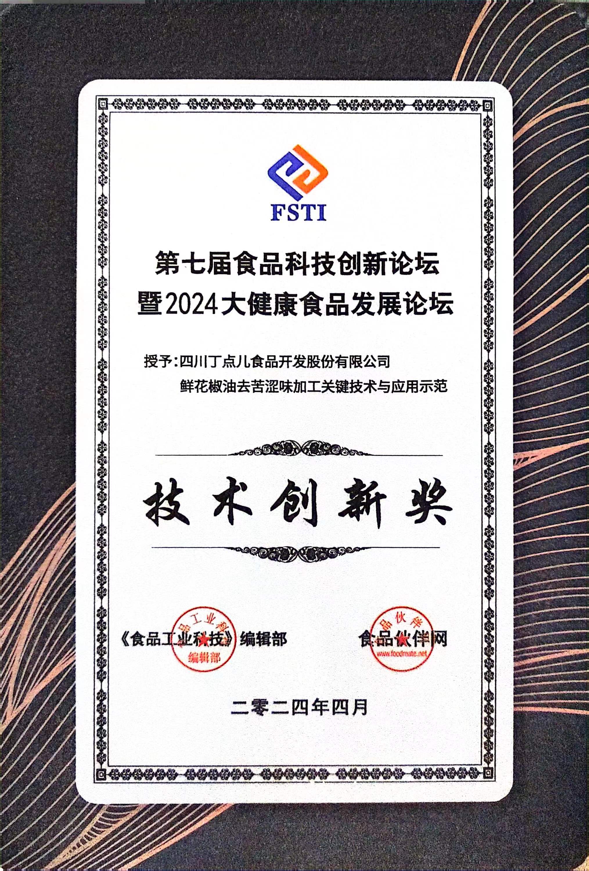 喜報!丁點兒食品“鮮花椒油去苦澀味關鍵技術”獲“技術創新獎”!